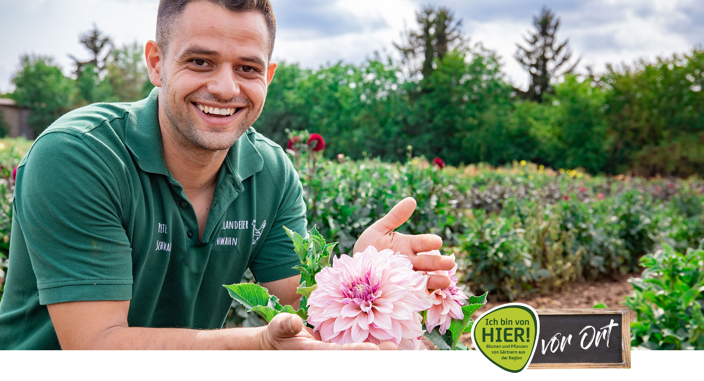 Aber nicht nur das! Auf dem Hof gibt es alle Hände voll zutun: Neben den Blumenkulturen wird auf 150 Hektar auch Biogemüse angebaut und in mehreren mobilen Ställen große Scharen von Freilandhühnern gehalten, die auf viel Fläche in der freien Natur aufwachsen und nach Herzenslust scharren können. Für den Blumenanbau sind sie ein Geschenk, denn auf dem benachbarten Freilandrosenfeld halten die gefiederten Helferlein die Reihen ganz natürlich unkrautfrei. Betritt man den Betrieb, sticht ein liebevoll dekorierter Laden ins Auge. Hier gibt es allerlei direkt vom Hof in der Auslage zu kaufen. Neben den wunderschönen regionalen Schnitt- und Topfblumen, Stauden, Kräutern und Deko kann man hier auch das ein oder andere Schmankerl aus der eigenen Produktion probieren: Frische Eier, Gemüse und Kartoffeln, Nudeln und glückliches Freilandhuhn. Alles, was Peter Schwahn mit seiner Familie anbaut, ist zu hundert Prozent von HIER und das sieht (und schmeckt) man.